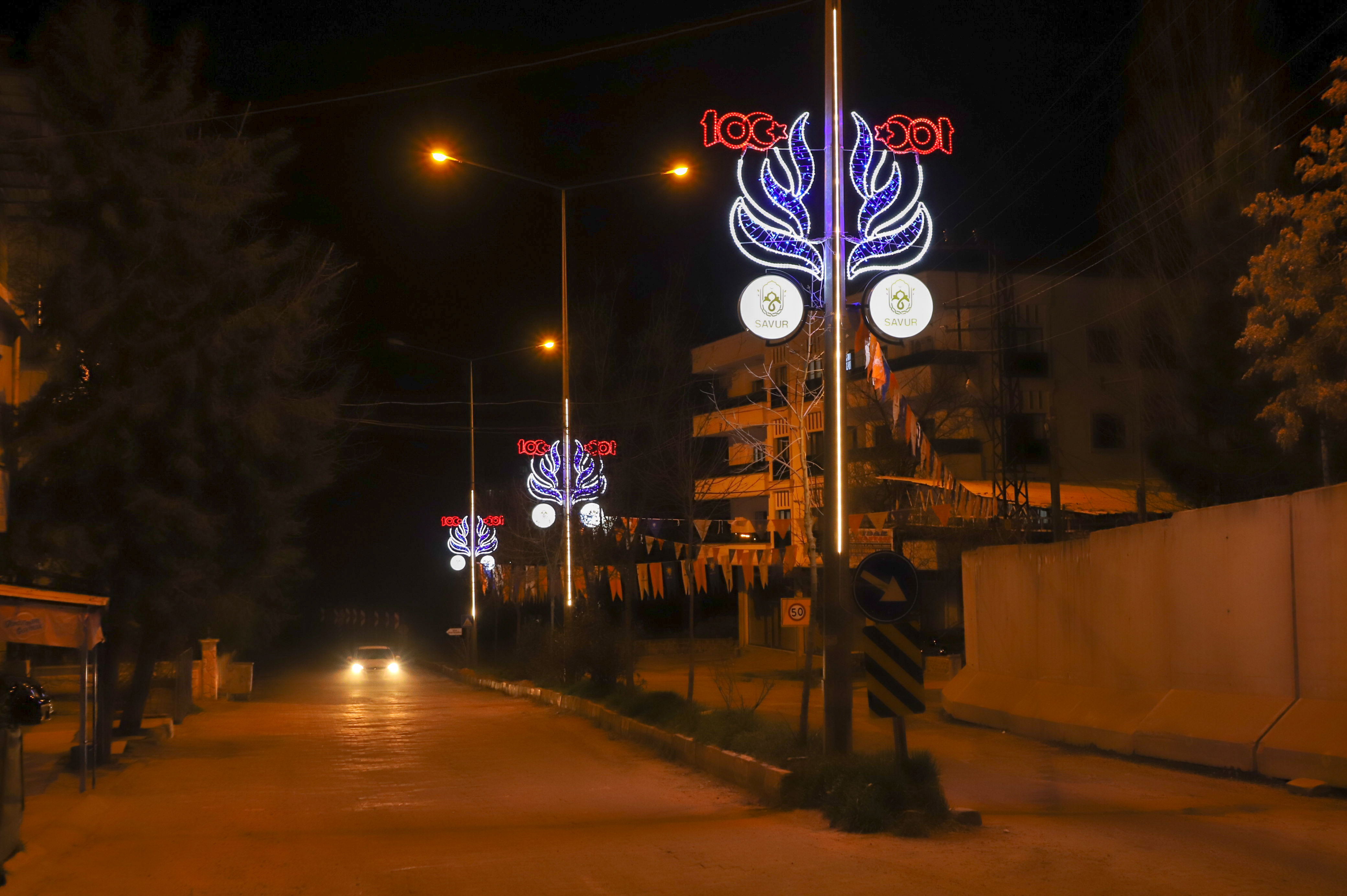 Türkiye 100 yılı teması kapsamında ilçemizin daha güzel bir görünüme kavuşması için Savur Belediyemiz tarafından sokak aydınlatma lambalarımızın yanına temaya uygun şekilde led aydınlatmalar yapıldı.